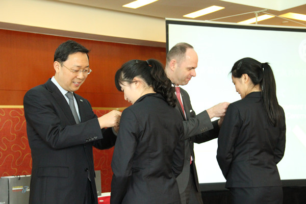 凯宾酒店人力资源总监张勇(左)饭店总经理白诗川(右)为学生戴名牌