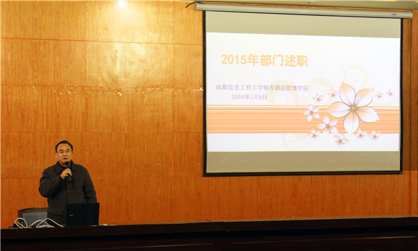 1月6日,我院2015年度部门公开述职大会在1122学术报告厅举行。学院党政领导班子成员,各系、部、处、室负责人和在校教职员工参加了本次大会。本年度,我院共有9个教学单位以及学院教务处、学生工作处、招生就业处、校企(地)合作办公室、对外交流中心(国际学院)5个行政职能部门进行了公开述职。大会由学院监察处暨目标管理办公室负责人景蜀萍主持。