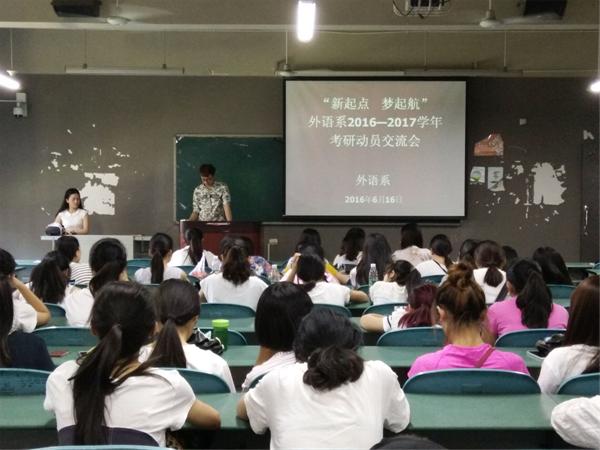 2016年6月16日星期四中午,外语系邀请到今年考研成功的学子来分享他们的考研经验,外语系尹莉老师作为考研指导老师代表也参加了此次交流会,向1217教室的在座50位在读外语系学生解答关于考研的相关问题。