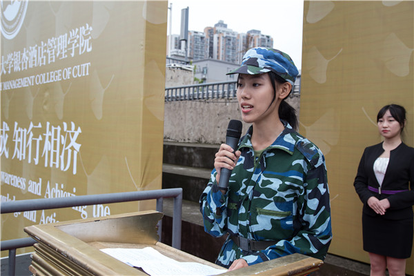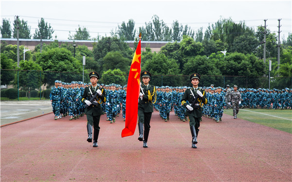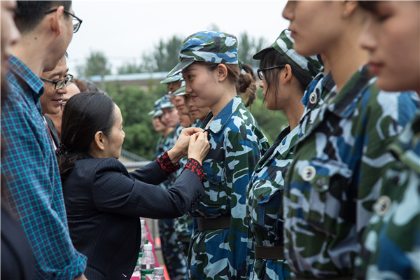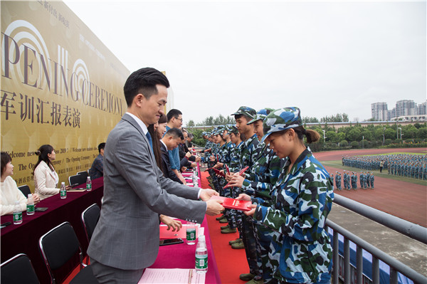 开学典礼暨军训汇报表演在院领导、教师代表、校友代表为新生代表授予校徽的仪式中落下帷幕。
