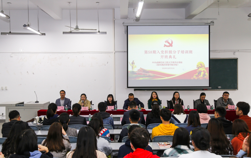 10月31日中午,中共成都信息工程大学委员会党校(银杏酒店管理学院分校)第58期入党积极分子培训班开班典礼在第一教学楼A1332教室举行。开班典礼由学院党委委员、党委工作部部长马倩同志主持。党委副书记桑作银同志,党委副书记、纪委书记、工会主席龚燕同志,党委委员李菲同志,党委委员袁一田同志,党委委员张艺同志出席典礼。党委工作部、党委教师工作部、党委学生工作部、党委保卫部负责同志,各党总支书记、副书记、总支委员、组织员以及58期党校全体学员参加典礼。