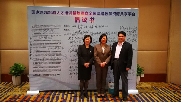会上,四川省旅游发展委员会人教处处长姚界平宣读了“建立全国网络教学资源共享平台”倡议书,并举行签约仪式,我院副院长刘丹代表我院与四川省旅游培训中心、各省市旅游培训中心和全国旅游培训院校负责人在倡议书上签字。