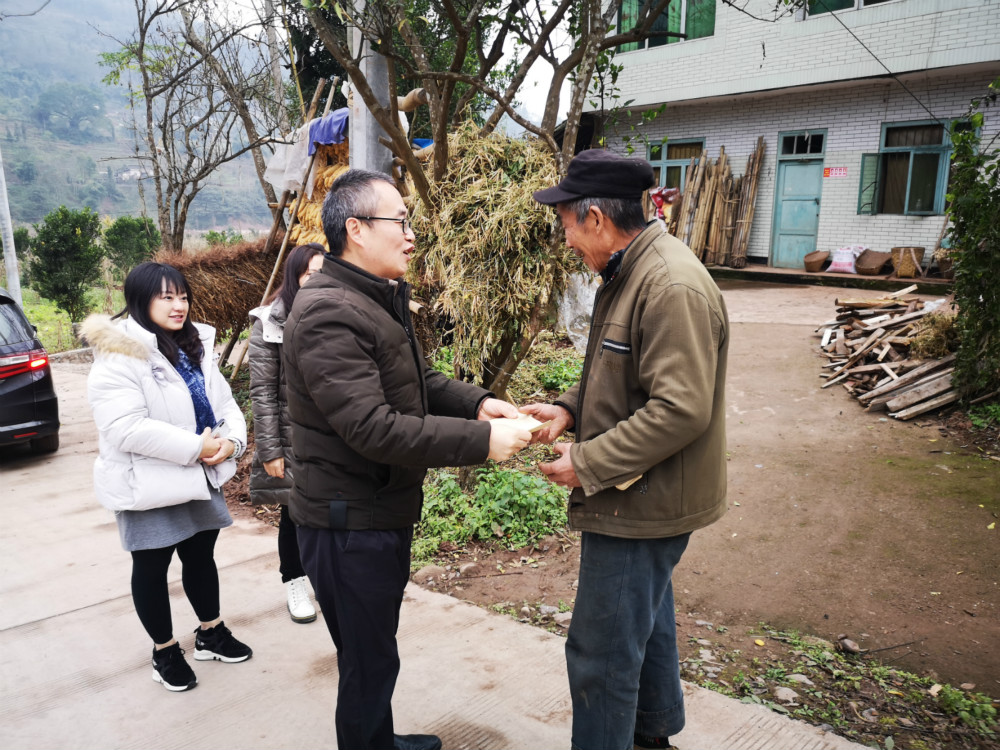 随后,桑作银一行先后来到困难老党员、五保户卢作排、以及学院对口帮扶的金秀英、蒋光明两户贫困户家里走访并开展慰问。桑书记与他们一道拉家常,询问生产生活情况,并送上慰问品。
