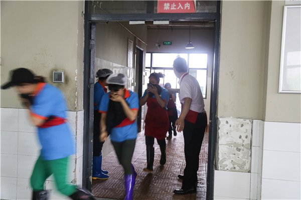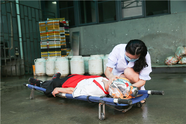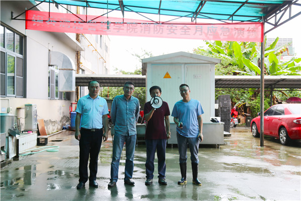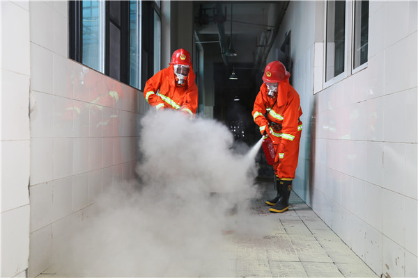 13时30分,分管安全副院长张智勇宣布演练正式开始。发现火险后,当班食堂员工立即向值班人员报告情况,并切断电源、气源开关,与值班人员组成第一灭火梯队,扑救初期火灾。保卫处接到报警后,当班校卫队员立即穿戴灭火战斗服,拿救援工具,驾驶电瓶巡逻车迅速到达火灾现场,戴上防毒面具,形成第二灭火梯队,立即展开灭火。