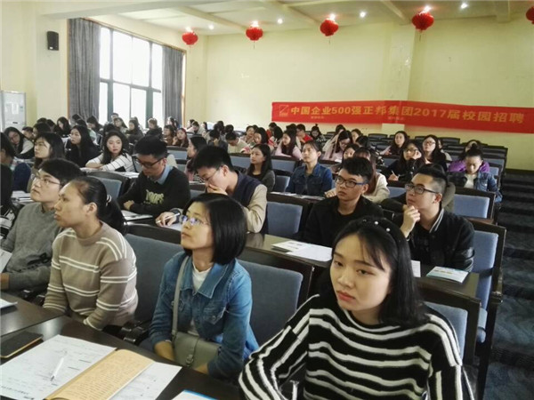 会上杨先玉先生和李茂清先生分别向同学们介绍了公司概况、历史背景以及员工的职业发展方向,让大家对公司有了初步的了解。正邦集团在企业经营过程中形成了“把小公司做成大公司,把大公司做成大家的公司”的核心价值观,追求“以人为本、以正兴邦”的经营哲学,不断弘扬“求实、和合、卓越”的企业精神;光谷云财务公司近年来发展迅速,主要强调团队凝聚力,以“效率最高,口碑最好”为核心竞争力,注重在优秀的应届生中提拔骨干。良好的企业文化有效地推动了两个公司的进步,优秀且稳定的专业管理团队已经成为它们快速、健康发展的基石。本次宣讲会上,两家公司的大门都向我们的毕业生敞开,两位主讲人就所属公司的用人标准和招聘岗位进行了详细的说明,同时,还就各位同学关心的问题,进行了一一回复。