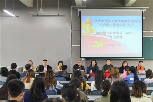 11月3日,中共成都信息工程大学委员会党校(银杏酒店管理学院分校)第52期入党积极分子培训班开班典礼在第一教学楼1330教室如期举行。开班典礼由学院党委工作部副部长马倩同志主持,学院党委副书记桑作银同志、旅游管理系党总支书记程莉同志;工商管理系党总支副书记张艺同志;外语系党总支副书记李丹同志;电子商务与信息管理系党总支副书记李俊杰同志;休闲运动管理系直属党支部书记欧繁荣同志;现代传媒系直属党支部书记赵远鹏同志;以及各系党总支委员等出席会议。本期党校培训班共有264名新学员参加培训。
