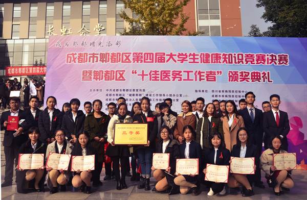 2017年11月26日上午,学院卫生防疫科王铃老师带领我院37名学生前往成都工业学院参加了成都市郫都区第四届大学生健康知识竞赛决赛暨郫都区“十佳医务工作者”颁奖典礼。