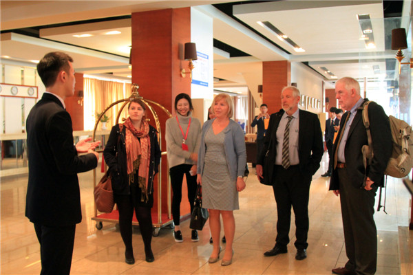 在我院国际学院院长何倩女士的陪同下,比利时贵宾参观了学院酒店博物馆和艺术馆,看到馆内的陈设及学生作品,现场外宾赞不绝口。随后,外宾来到了酒店系实验室进行参观。酒店系学生正在进行酒店实训课,活跃的课堂氛围,老师生动的讲解,学生积极的参与,展现了银杏学院的学子风貌,得到了外宾的高度赞扬。参观过程中,何倩院长向Go2learn董事详细介绍了银杏学院的教学模式,特别介绍了银杏国际学院的课程设置,出国就业板块的模式。Luc董事也介绍了比利时鲁文学院的概况,并且热情的邀请何院长到对方学院进行实地考察。