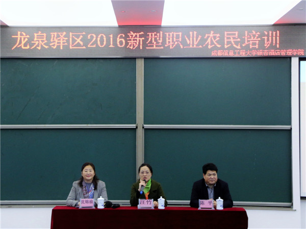龙泉驿区农村发展局科教科科长汪竹女士,学院副院长沈锦渝女士,电子商务与信息管理系系主任陈平教授出席了开班仪式并讲话,会议由电商系党总支副书记兼办公室主任李俊杰主持。来自龙泉驿全区的95名农业生产大户、家庭农场主、合作社骨干等参加了此次培训班学习。此次培训,为农户提供了相互学习及取长补短的交流平台,培训为期15天,分为2个阶段培训,将采取培训与实践相结合,培训与农业生产相结合的原则。在接下来的课程中主要将以集中培训,现场实践,跟踪服务等方式,围绕新型农民信息化、农产品质量安全与市场营销、农产品电子商务、经营管理常识进行开展服务。