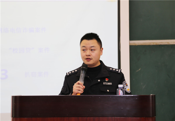 姜警官以发生的真实案件为例,向师生们介绍了电信网络诈骗的特点及防范要点。他指出,电信诈骗手段翻新速度快,且大部分是团伙作案,犯罪嫌疑人具备反侦查能力和存在跨国跨境犯罪等特点,使案件侦破难度大,因此一定要增强防范意识,不给犯罪分子以可乘之机,并提醒师生在防范电信网络诈骗方面一定要做到不轻信、不透露、不转账,遇到诈骗及时报案。另外,姜警官还结合高校的发案特点讲解了应对校园贷和扒窃的防范措施。