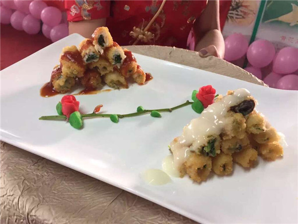创意菜品环节结束后是规定菜式的展示,本次比赛规定菜式要求以“鱼”为主材,由选手们自由发挥,经过前期的准备与现场20分钟的紧张制作,最终呈现在评委与观众眼前的菜品让人惊叹,五组选手制作的菜品分别是:椒盐鱼饺、菠菜鱼肉卷、缤纷糖醋鱼、松鼠鱼、凤穿金衣,五道以鱼为主材的菜品不仅色香味俱全,极具创意,还具有丰富的营养价值,得到评委与观众的一致好评,由杨辉老师对菜品进行专业的点评。