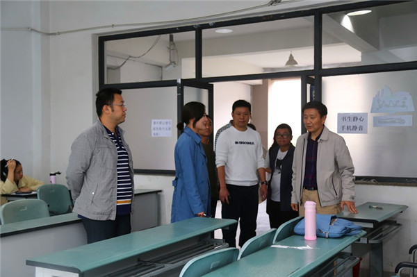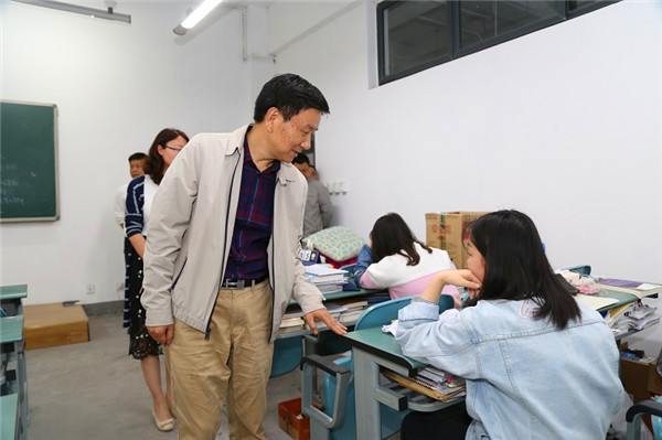 在第二教学楼,张智勇进入考研专用教室,查看了教室设施设备情况,并与在场学生亲切交谈,了解了学生自习和考研准备情况,并勉励同学努力学习。