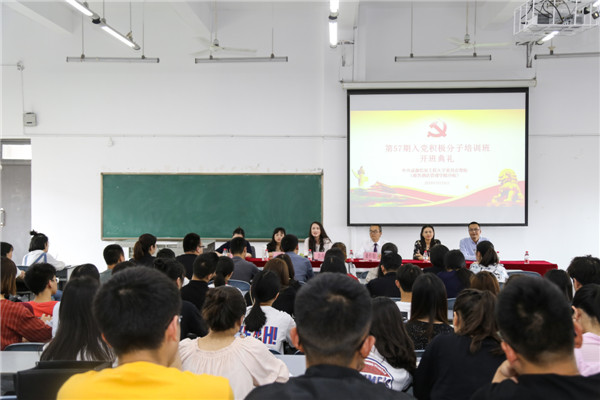 5月15日中午,中共成都信息工程大学委员会党校(银杏酒店管理学院分校)第57期入党积极分子培训班开班典礼在第一教学楼A1431教室举行。开班典礼由学院党委工作部部长马倩同志主持。党委副书记桑作银同志;学院党委副书记、纪委书记、工会主席龚燕同志;学院党委委员、财务管理系党总支书记李菲同志;学院党委委员、工商管理系党总支书记张艺同志;党委保卫部部长张立铣同志;酒店管理系党总支书记李俊杰同志;机关党总支副书记张娅同志;信息工程管理系党总支副书记杨婷同志;艺术设计系党总支副书记孙传宝同志;外语系党总支副书记张先梅同志;旅游管理系党总支副书记李姣楠同志;休闲运动管理系党总支副书记蒋易庭同志;思政部(基础部)直属党支部书记赵远鹏同志;另外还有此次党校授课教师、各系党总支委员、组织员以及57期党校学习的全体学员参加会议。