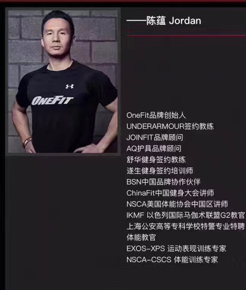 主讲人简介:陈蕴,男,毕业于华中科技大学,OneFit品牌创始人,UNDERARMOUR签约教练,JOINFIT品牌顾问,AQ护具品牌顾问,舒华健身签约教练,遂生健身签约培训师,BSN中国品牌协作伙伴,ChinaFit中国健身大会讲师,NSCA美国体能协会中国区讲师,IKMF以色列国际马伽术联盟G2教官,上海公安高等专科学校特警专业特聘体能教官,EXOS-XPS运动表现训练专家,NSCA-CSCS体能训练专家。