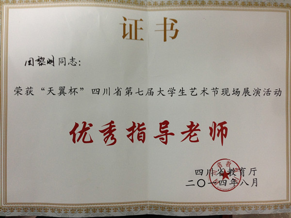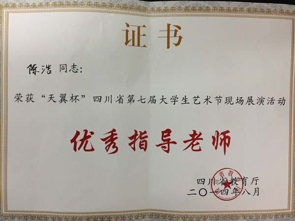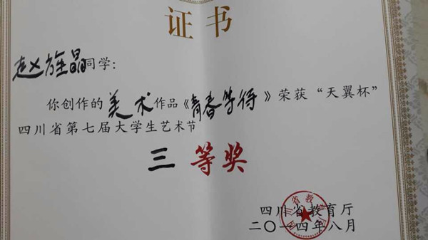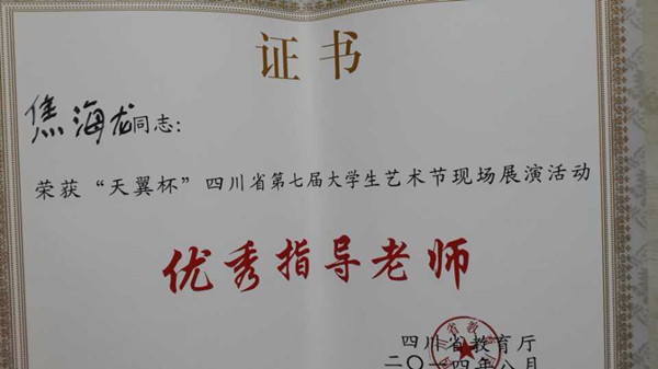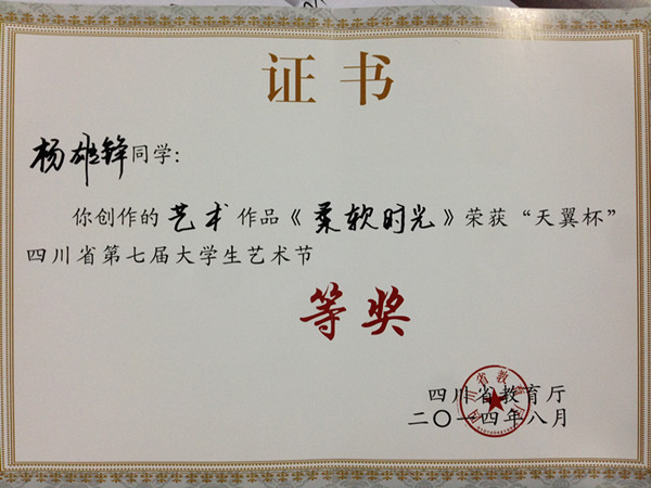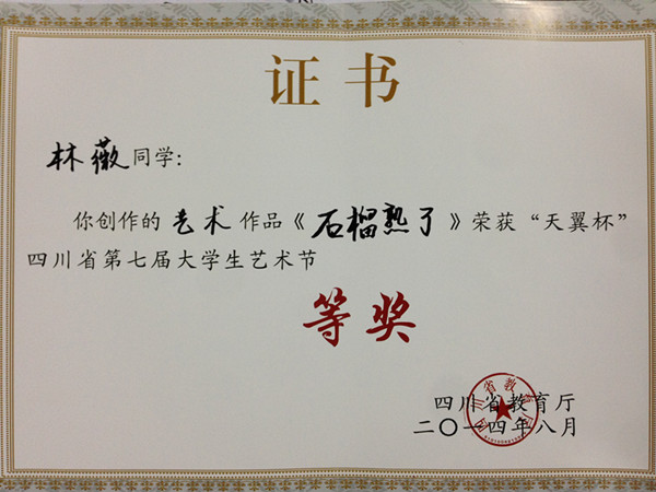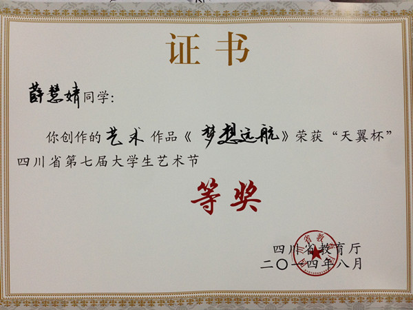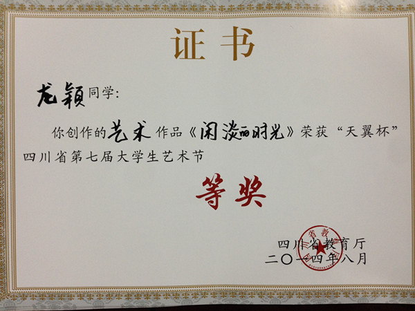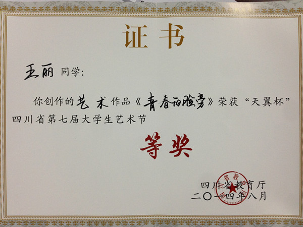 我院学生作品在四川省教育厅举办的“天翼杯”四川省第七届大学生艺术节中收获颇丰,获得了三银六铜的好成绩。其中院合唱团选送的《在灿烂的阳光下》获得声乐类作品铜奖;杨雄锋的《柔软时光》、王丽的《青春的脸旁》和龙颖的《闲淡的时光》等三幅作品获得大赛美术作品类银奖;林薇的《石榴熟了》、赵敏的《盛装的阿婆》、吴晓然的《静静的故园》、薛慧婧的《梦想远航》以及赵旌晶的《青春等待》等五幅作品获得大赛美术作品类铜奖。陈浩、周黎明、焦海龙、邓丽平、王志等老师获得了大赛优秀指导老师荣誉称号。