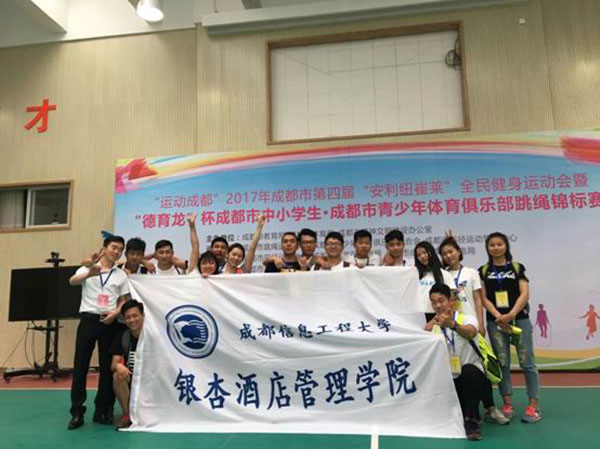 我院休闲运动管理系六名跳绳队员孙佳哲、屈昭琼、刘成富、蒋佳男、唐荣、向梅华代表我院参加了本次比赛。在高手如云的赛场上,队员们顽强拼搏,获得团体一等奖的好成绩。