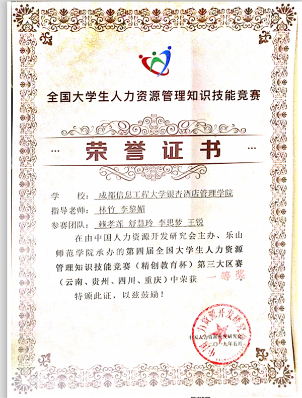 学院工商管理系人力资源管理1班的赖孝莲、舒慧玲、李思梦、王锐等同学组成的参赛队,在教师林竹、李黎媚的带领下,经过模拟六年竞赛抗衡,获得本次比赛一等奖。