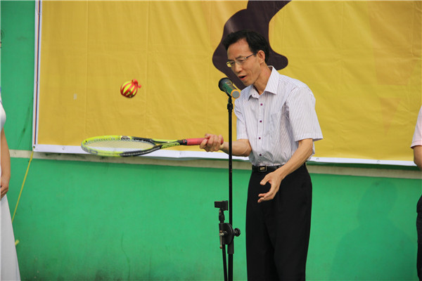 成都信息工程学院党委书记兼省高校网球协会主席赖廷谦教授宣布比赛开始并开球 学院宣传处摄