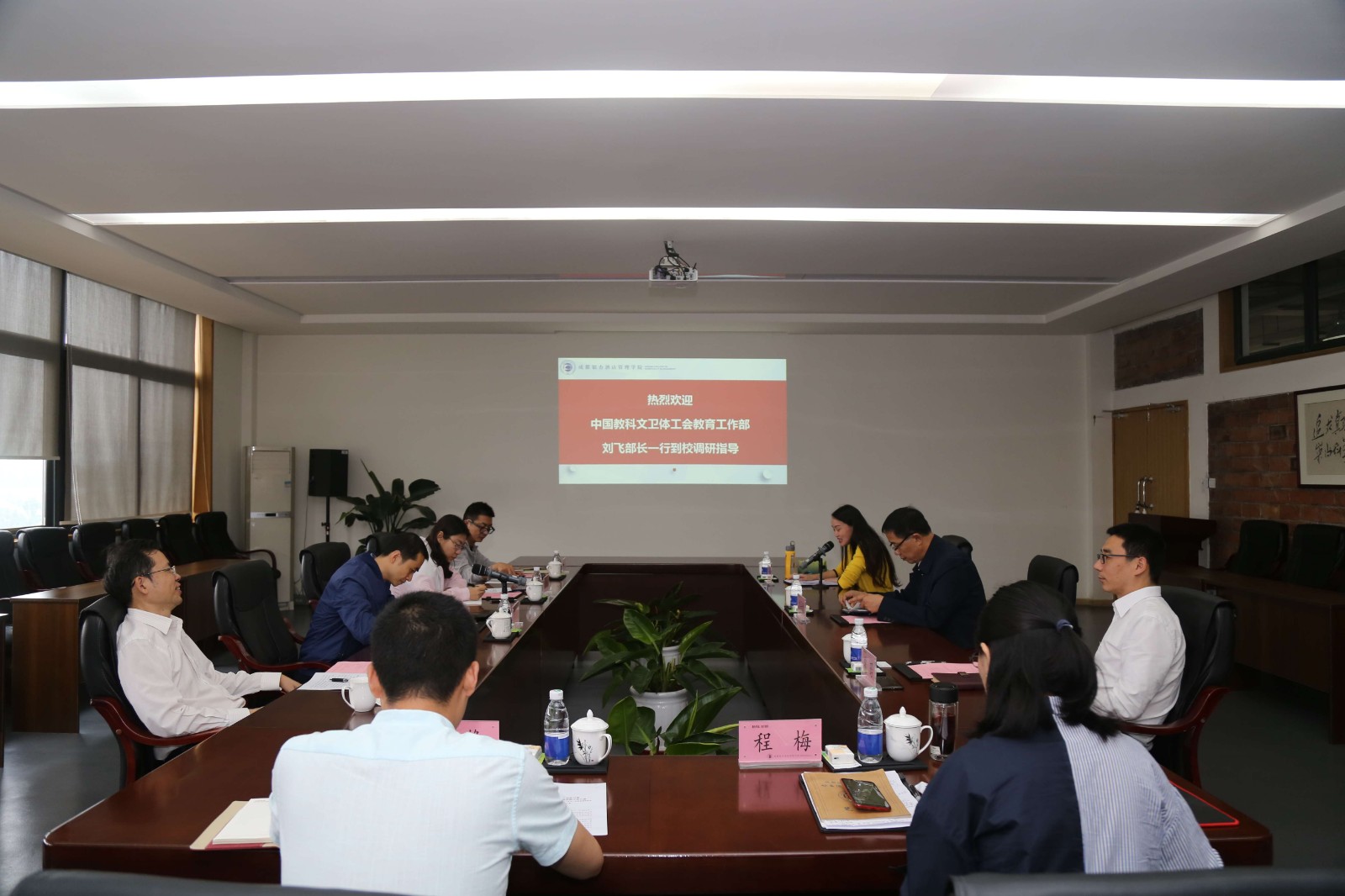 5月25日,中国教科文卫体工会教育工作部部长刘飞及四川省教科文卫工会主席李长春一行莅临学院考察调研。四川省人民政府教育督导专员兼学院党委书记刘吾康、学院院长魏昭、学院党委副书记兼工会主席龚燕、学院工会副主席兼女工委主任程梅参加调研会议。