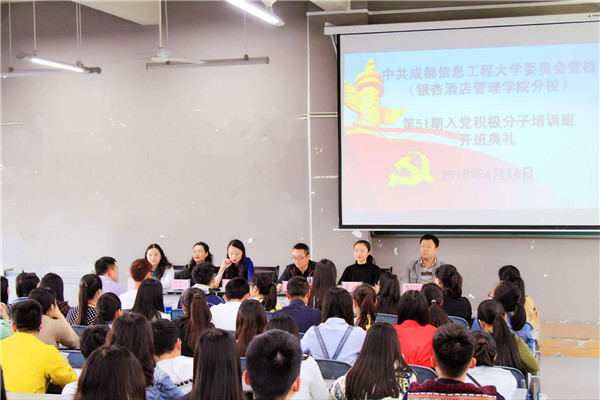 4月14日,中共成都信息工程大学委员会党校(银杏酒店管理学院分校)第51期入党积极分子培训班开班典礼在1330教室如期举行。开班典礼由学院党委副书记兼纪委书记龚燕同志主持,学院党委副书记桑作银同志,党委委员、人事处副处长袁一田同志,党委委员、监察处处长景蜀萍同志,学工部副部长、学生处副处长、团委书记李瑞泉同志,党委工作部副部长马倩同志以及各系党总支书记、总支委员等出席会议。本期党校培训班共有近277名新学员参加培训。