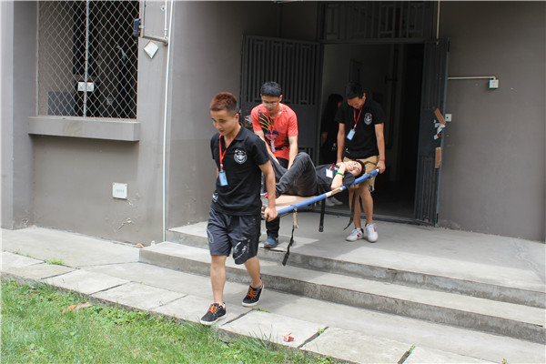 本次演练还增加了救护项目,将受伤学生用担架抬出宿舍,为受伤学生进行心肺复苏、伤口包扎等救护演练,让整个演练过程更加真实。