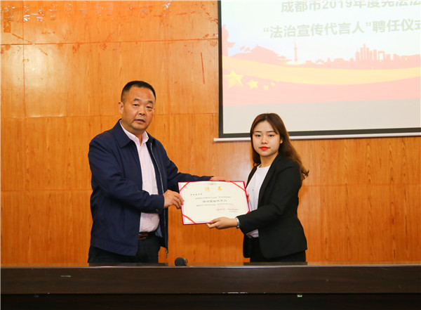 郫都区司法局副局长杨林为罗雨洁同学颁发聘书