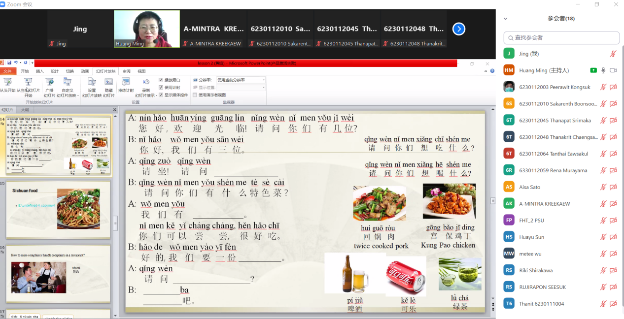 为深化我校与海外合作院校的国际交流,进一步推进我校的课程国际化,2021年11月10日和24日,由国际学术交流与研究中心牵头组织,外语系主导,我校成功为泰国宋卡王子大学酒店与旅游学院(PSU-FHT)的36名学生在线上开展了两场主题为“酒店中文”的语言文化课程。