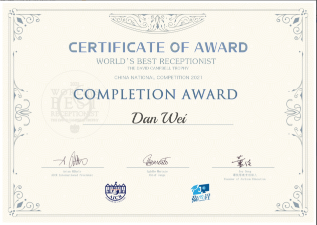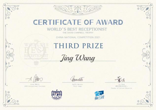 2021年11月26日,全球最佳酒店接待冠军杯(中国赛区)AICR总部全球选拔赛落下帷幕,来自厦门大学、天津外国语大学、四川旅游学院、成都银杏酒店管理学院、中国劳动关系学院、上海华尔道夫酒店等16名选手参加本次比赛。经过激烈的角逐,我校学生王菁、韦丹在酒店管理系白永忠、陈雪两位老师的指导下,分别荣获本次选拔赛中国赛区季军、优胜奖。