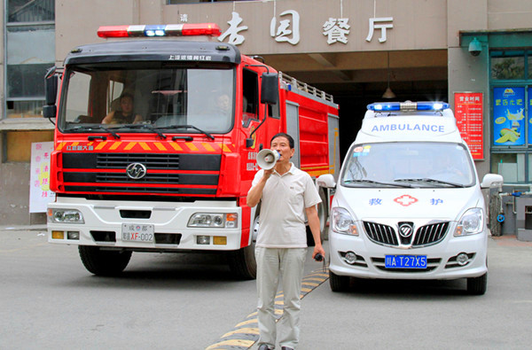 中午12:30时,参加本次演练的辅导员、保卫人员和学生安全管理委员会的同学在各自岗位待命。12:50时犀浦消防中队消防车、红光派出所警车及红光卫生院救护车也已到位,一切准备就绪。13:00时,保卫处副处长何诗源发令,演练正式开始。消防车、救护车和学院广播室马上响起警报,校卫队员敲响了警钟,学生安委会同学点燃烟雾弹,现场浓烟滚滚,同学们在辅导员的指挥下快速有序地,按照安全出口标志从安全通道撤离到了楼外安全区域。