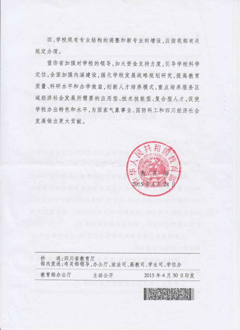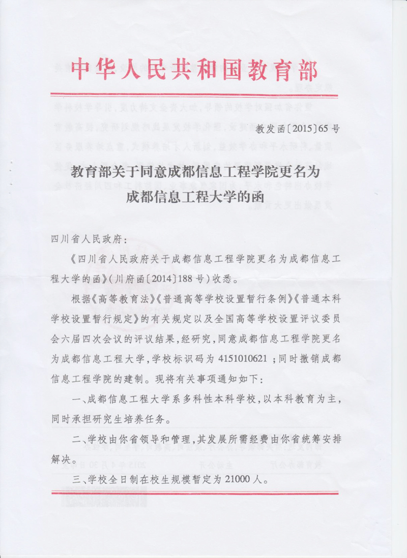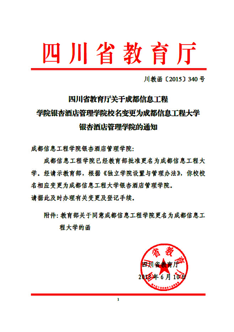 成都信息工程学院已经教育部批准更名为成都信息工程大学。经请示教育部,根据《独立学院设置与管理办法》,你校校名相应变更为成都信息工程大学银杏酒店管理学院。 请据此及时办理有关变更及登记手续。