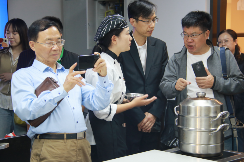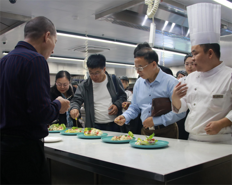 现代酒店管理学院院长陈广、银杏·标准酒店总经理王俊、宜宾校区综合办公室主任李进周等学校相关负责人陪同调研组参观了银杏教学酒店和各实训场地。调研组在实训课堂上品尝了学生的学习实践成果,充分感受实训教学的创新。