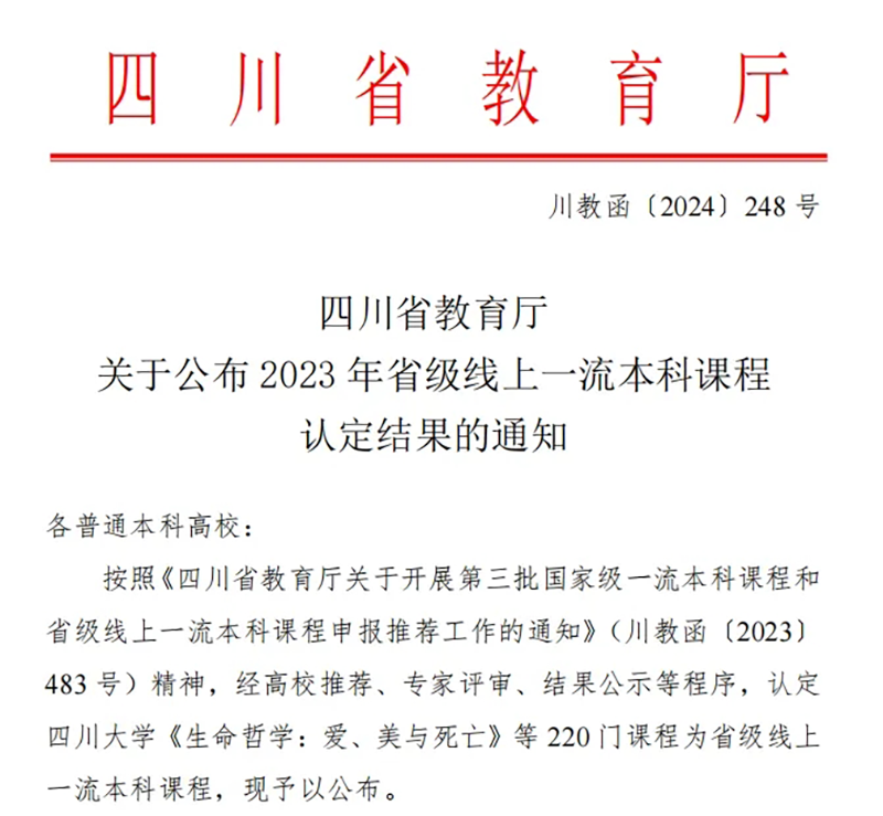 近日,四川省教育厅发布了《四川省教育厅关于公布 2023 年省级线上一流本科课程认定结果的通知》(川教函〔2024〕248号),我校《旅游英语》《旅游与酒店业》2门课程被认定为四川省线上一流本科课程。