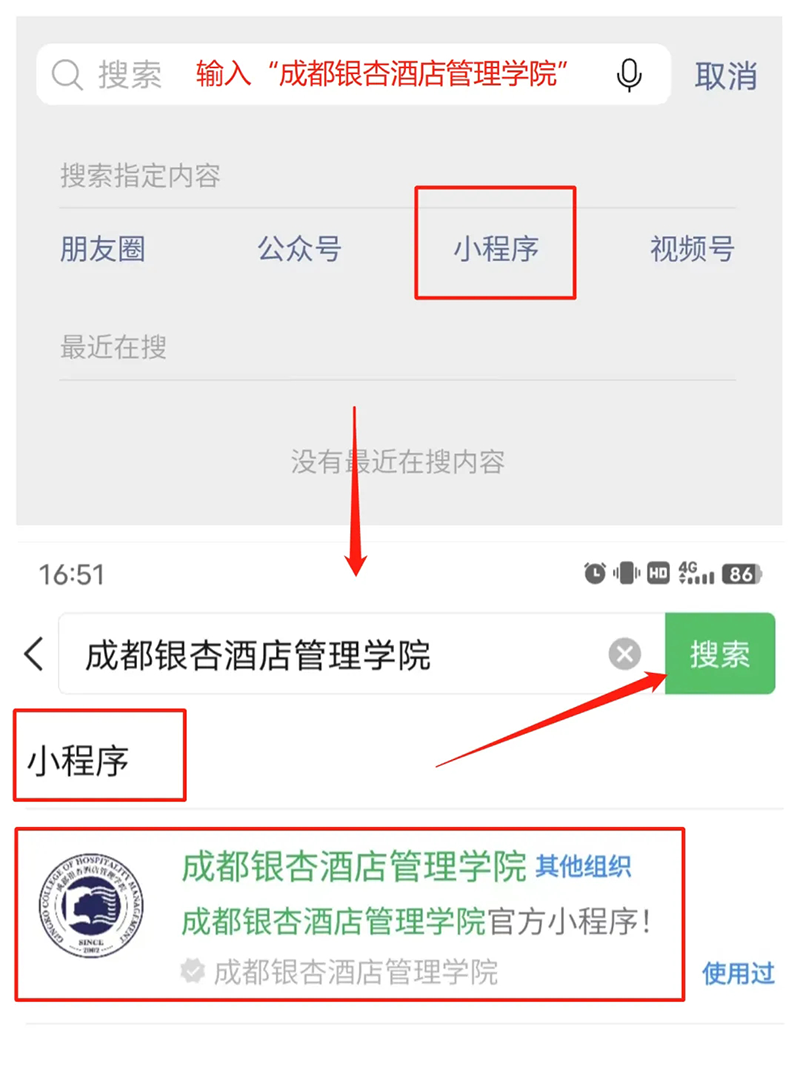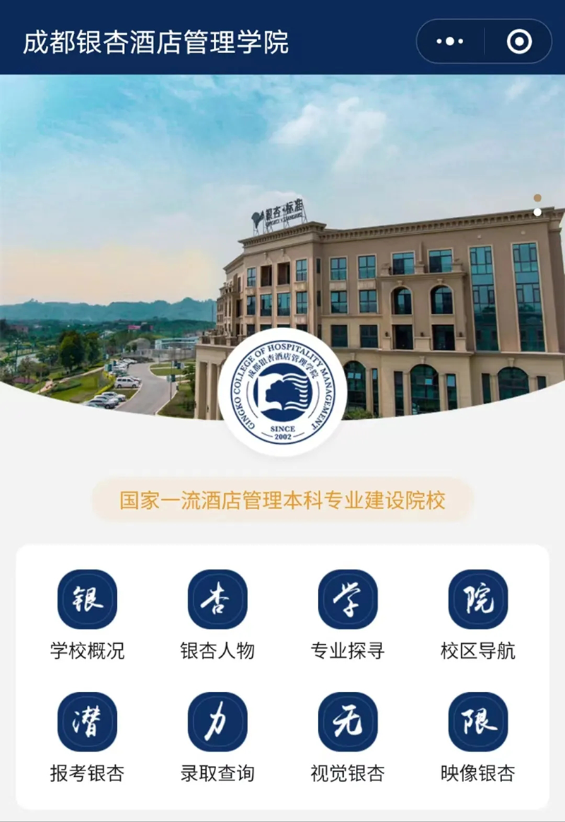 官方小程序:1.扫码可跳转查看我校官方小程序;2.微信搜索小程序“成都银杏酒店管理学院”