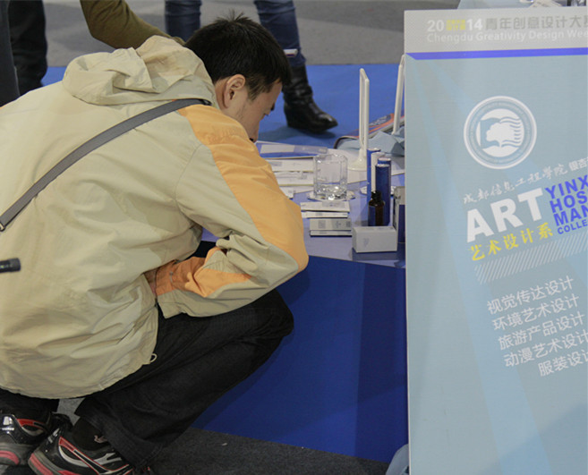 展会上,斩获金奖的“蜀界”APP界面设计,将传统川剧脸谱搬上iPhone,这项传统文化与现代科技的结合创意吸引了众多观众驻足观看;由我院刚成立不久的学生模特队的服装展演也成为大赛展区扯人眼球之处;许多具有四川文化的创意旅游产品设计颇得部分企业的青睐;有着大胆创新思维的工业设计作品,如磁悬浮空调等,还收到了风投机构意向合作研发的橄榄枝。