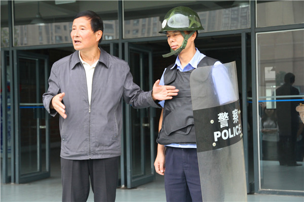 实践课程选在行政楼前广场,何处长首先以自己居住的小区为例向同学们讲解了物业管理的实际操作知识,并向同学们简要介绍了目前国内物业管理工作的现状及发展前景;讲解之后,何处长亲自示范,与安保人员一起演示了胶棒、防刺背心、盾牌、防爆叉等安保器械使用与注意事项。同学们对这堂特殊形式的实践课反响良好,纷纷试穿防刺背心,饶有兴趣的试用防爆叉等安保器械。课后,任课老师表示本节课基本达到了教学目的。