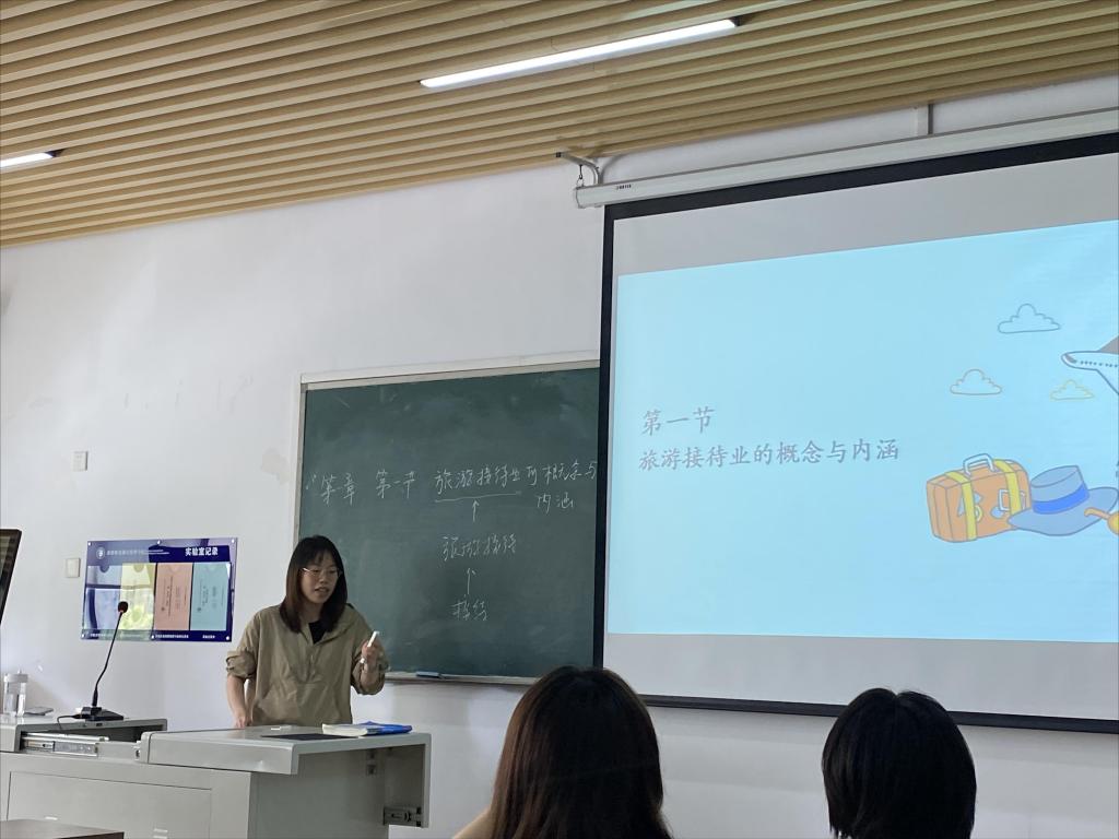 活动围绕王铭嘉《旅游接待业的概念与内涵》、刘颖《研学旅行指导师实务-常见的问题与处理》两门课程展开,涵盖说课、讲课、点评环节。两位教师详细介绍教学设计并模拟授课,展现了良好的教学准备与课堂表现。