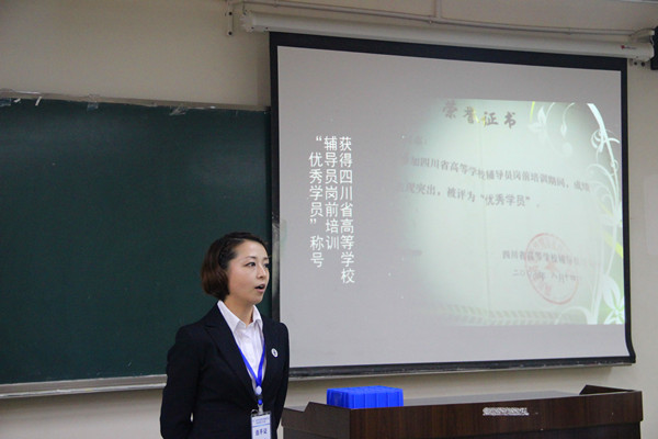 在27日的初赛中,娜娜老师在“自我介绍”环节,表现得十分自信、感情充沛,充分表达了她对学院的热爱,对辅导员职业的热爱,对学生的关爱,获得全场热烈的掌声。在“主题班会视频展示”环节,娜娜老师展示了她的“职业生涯规划”主题班会,其内容紧贴学生的实际,得到评委和全场观众的肯定。