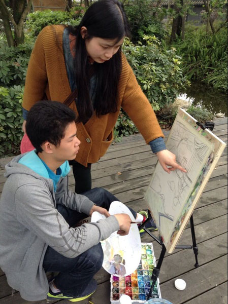 经过第一天的踩点取景,同学们于8号早上正式开始写生创作阶段。在写生过程中,同学们都认真作画,由于大家选点取景不集中,任课老师和辅导员耐心巡视整个写生片区监督学生写生情况以及安全情况,教学老师也依次对同学们进行一对一的辅导教学,每天写生结束后,负责教学的老师根据班级分配,分别对负责班级进行作品评审和修改。每天晚上,辅导员按时查寝,确保同学们按时归队。