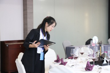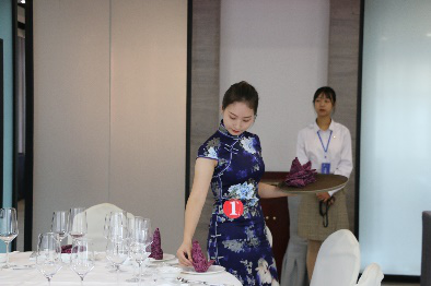 比赛期间,每位参赛选手需在30分钟内独立完成宴会设计、装饰、摆台、 菜单安排、酒水服务和10分钟的餐巾折花操作。选手们娴熟的操作手法,较高的专业技能和职业素养,获得专家裁判的一致好评。学院院长魏昭、执行院长杨龙涛亲临比赛现场观摩指导。