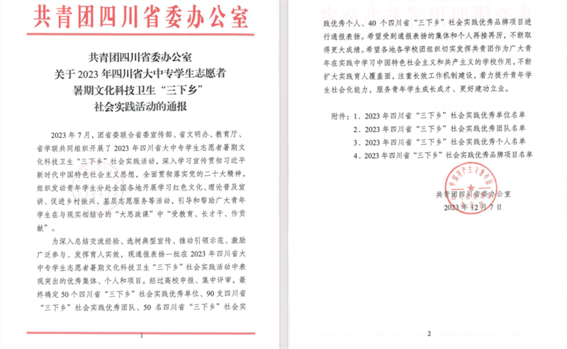 近日,共青团四川省委办公室对在2023年四川省大中专学生志愿者暑期文化科技卫生“三下乡”社会实践活动中表现突出的优秀集体、个人和项目进行了全省通报表扬。其中,由我校财务管理学院与工商管理学院联合组成的“同心燃梦”志愿服务队被授予了四川省“三下乡”社会实践优秀团队荣誉称号!